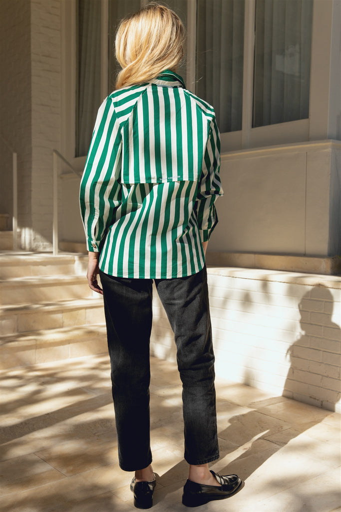 Giving all the Beverly Hills Hotel vibes, this is not your husband's fishing shirt. Our best selling favorite, now available in a green cabana stripe! Featuring a raglan sleeve for a more feminine fit, this shirt is great on or off the water. Pair with shorts and a swimsuit offshore or with jeans and sandals around town. Or wear it with our Emma Skirt in Green Cabana Stripe for the full look! Also features a vented back and water resistant fabric with a button front closure and velcro front pocket.