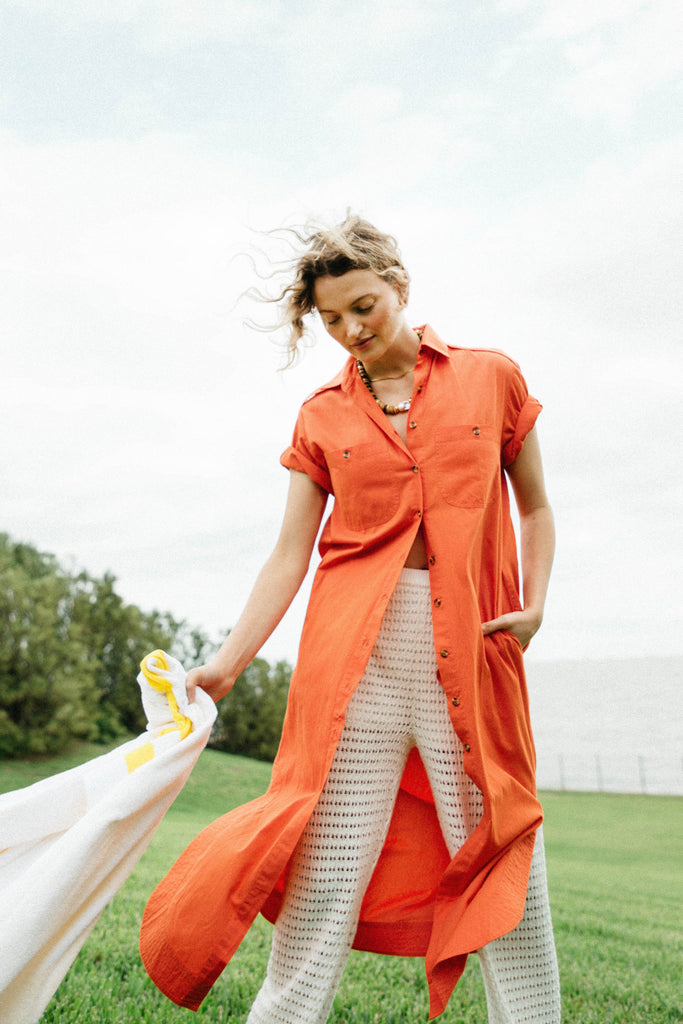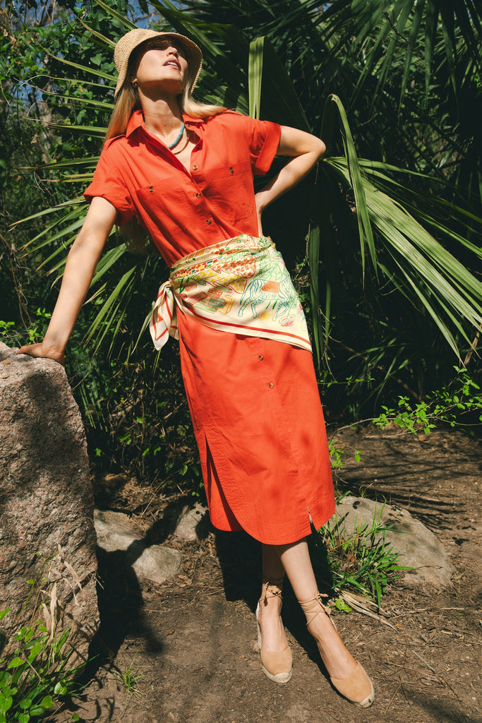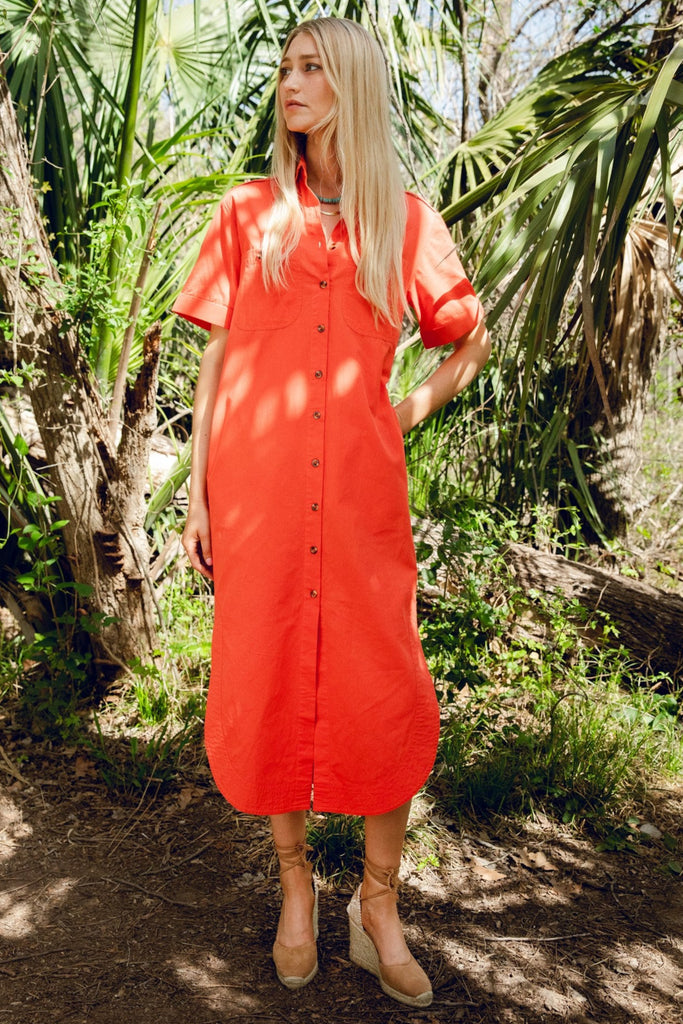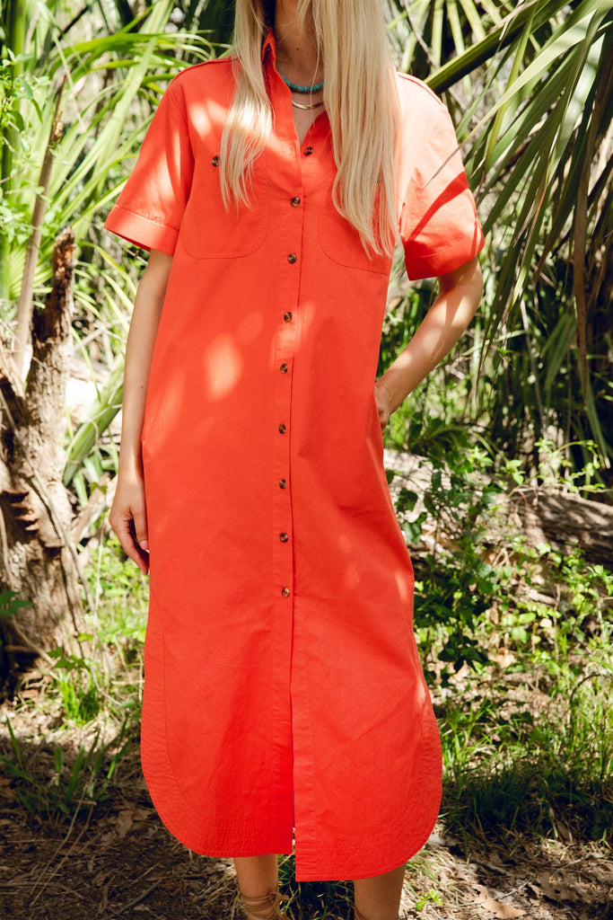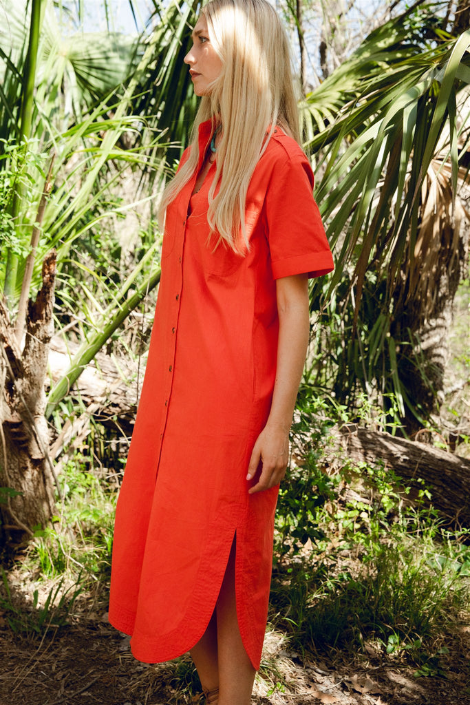 A new edition of an LC classic, we bring you our take on a classic midi dress perfect for everyday. Features a button front closure and structured collar with a front pocket and side pockets and our signature rounded hem, this style is functional and chic year round. We love styling with a platform sandal or a classic sneaker.