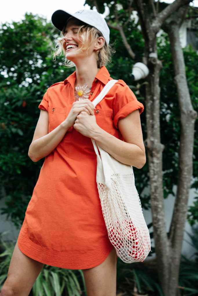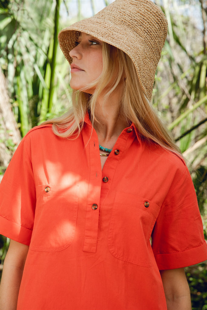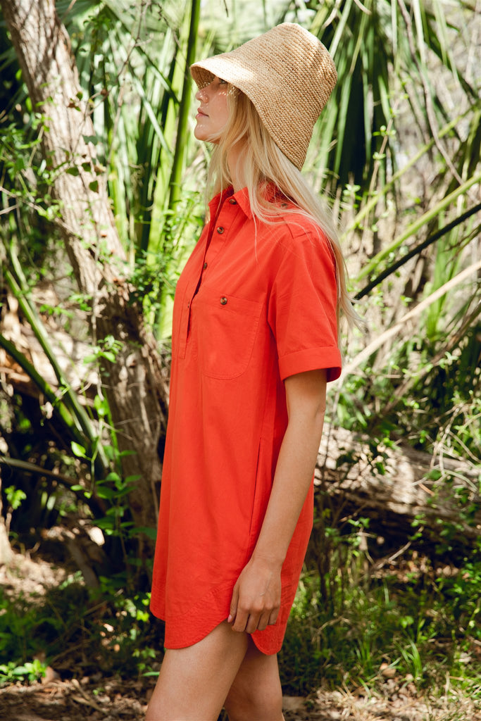 A new edition of an LC classic, we bring you our take on a classic mini dress perfect for everyday. Features a button front popover closure and structured collar with a front pocket and side pockets and our signature rounded hem, this style is functional and chic year round. We love styling with a platform sandal or a classic sneaker.