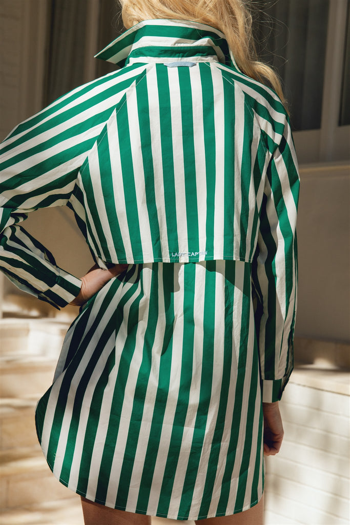Giving all the Beverly Hills Hotel vibes, this best selling favorite is now offered in a green cabana stripe! Featuring a raglan sleeve for a more feminine fit, this shirt dress is great on or off the water. Intended to be worn over a swimsuit (so no need for shorts!) or pair with cutoffs and sandals running around town. Also features side pockets, a vented back and water resistant fabric with a button front closure and velcro front pocket.