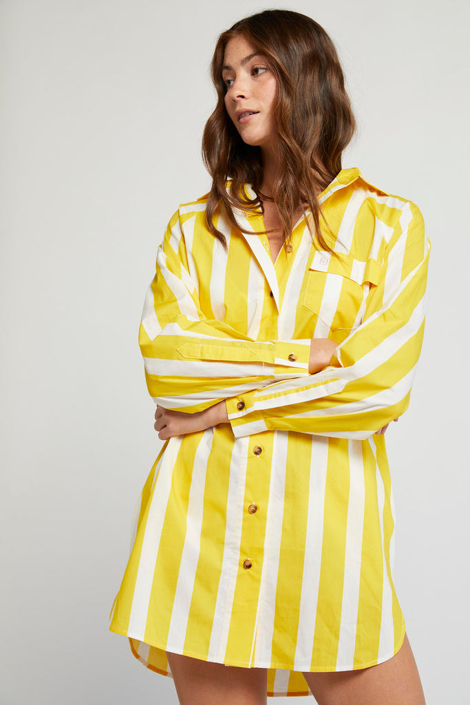 From our signature utility collection, we bring you our Lady Captain original fishing tunic. This best selling favorite is now offered in a cabana stripe! Featuring a raglan sleeve for a more feminine fit, this shirt dress is great on or off the water. Intended to be worn over a swimsuit on the boat or at the beach so no need for shorts or pair with cutoffs and sandals running around town. Also features side pockets, a vented back and water resistant fabric with a button front closure and velcro front pocket.