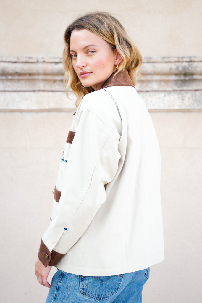 Our sophomore outerwear piece, we are excited to launch the Lady Captain Brush Jacket. This is the perfect layering jacket to add to your everyday repertoire. Pair over the matching Aunt Beth's Ranch Shirt in Mocha Plaid or our Knit Boat Neck Top in Ivory, this jacket features a canvas body plus corduroy collar and mocha plaid lining to match our Fall '25 collection.