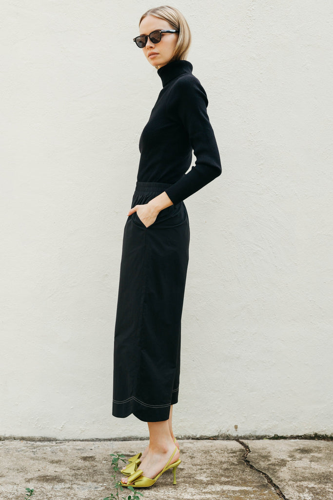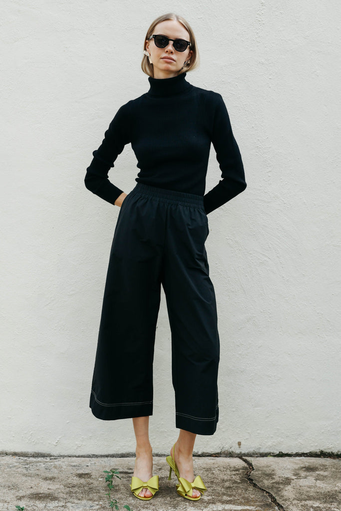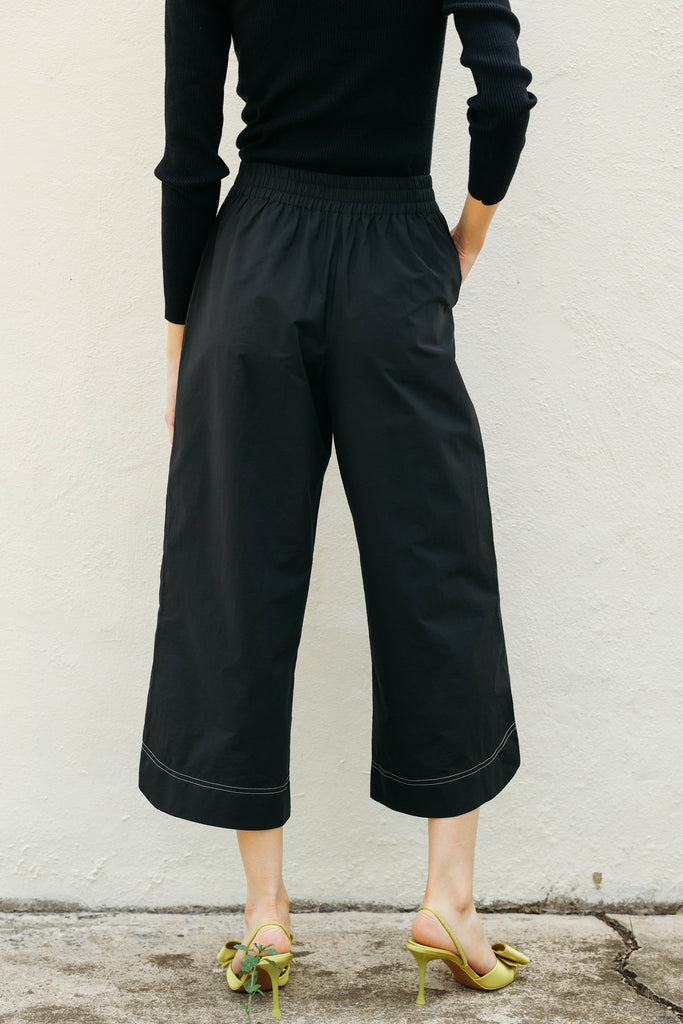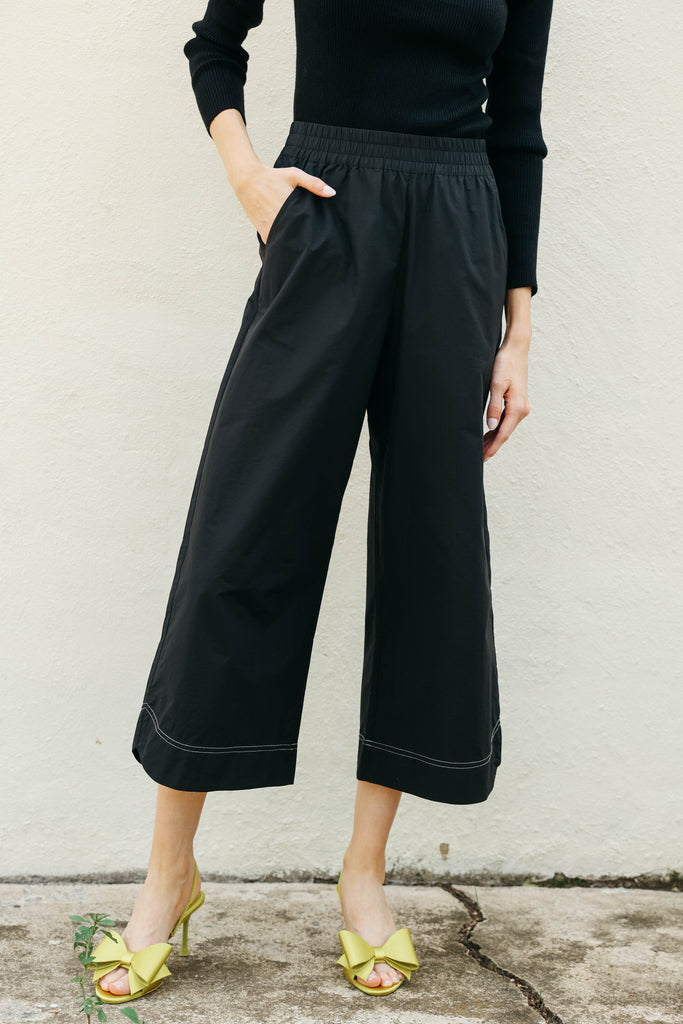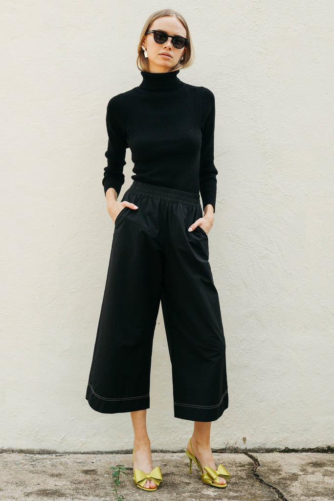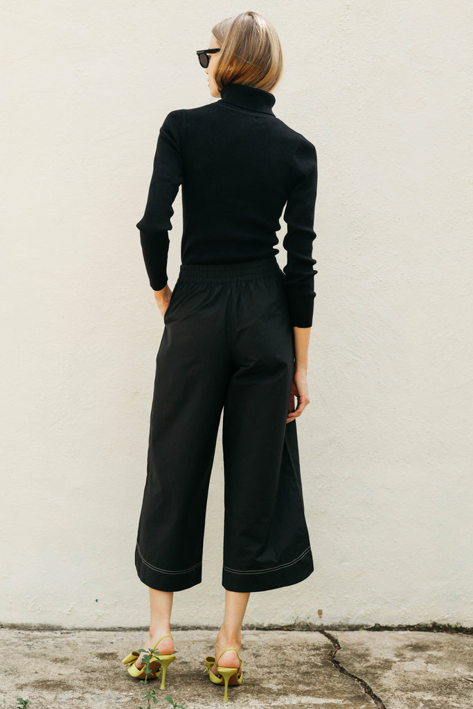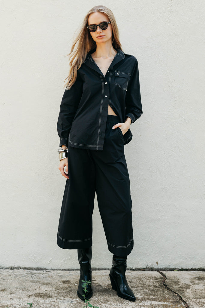 Say hello to your new go-to pull on pants. Features an elastic waist making it easy to pair with your favorite sweater or our matching Fishing Shirt in Black + Ivory, these wide leg pants are a total dream. New added detail- contrast ivory stitching makes this a closet staple with an edge. Fits true to size with the most breathable fabric and our signature curved hem at the bottom, these are soon to be a fav year round.