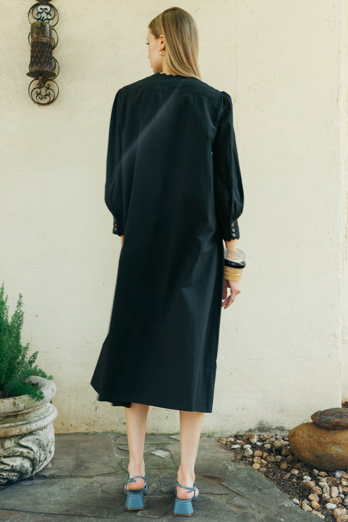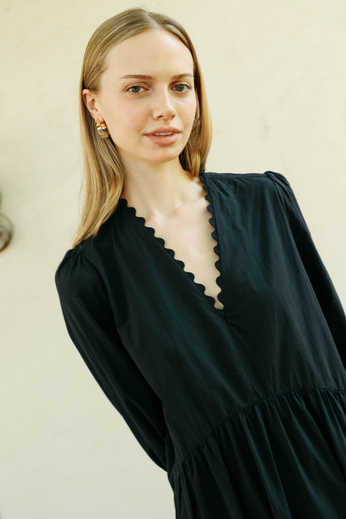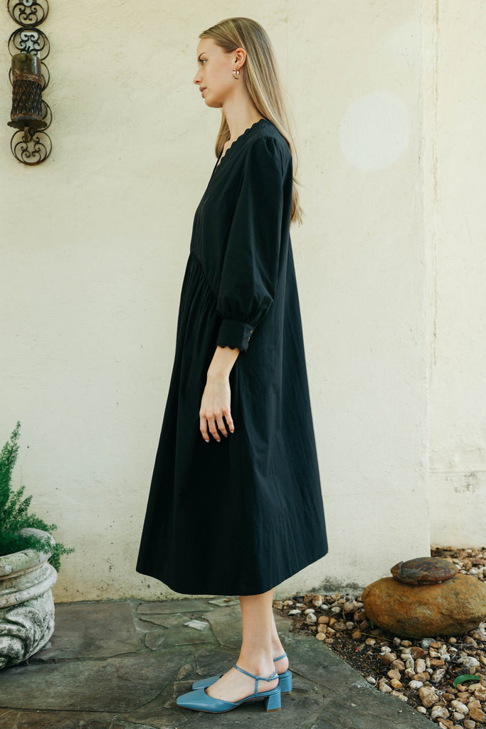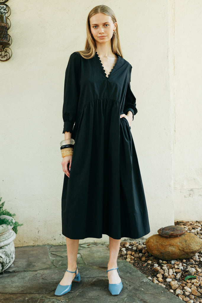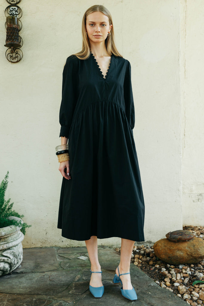 The perfect dress up or down cotton dress. Features a V-neck with scalloped trim and button closure at the wrists, this classic with a twist can be worn with sneakers, boots, sandals or heels.