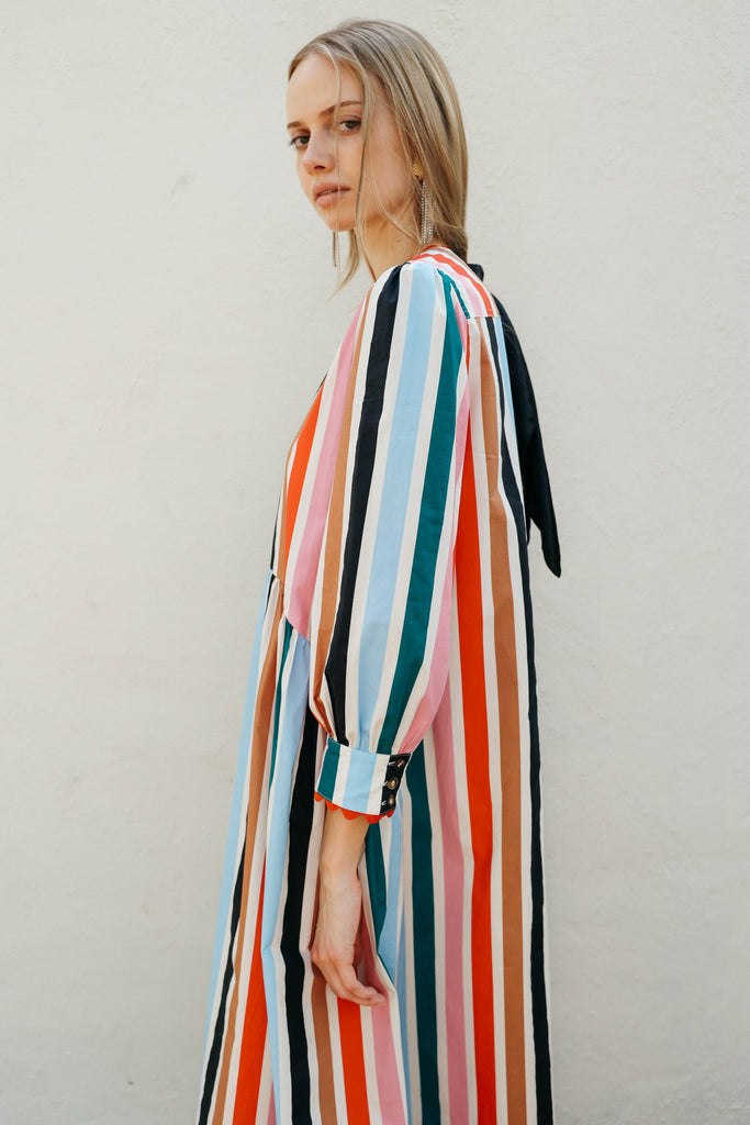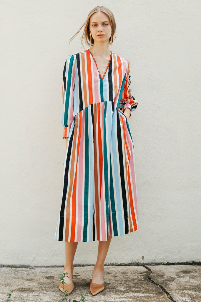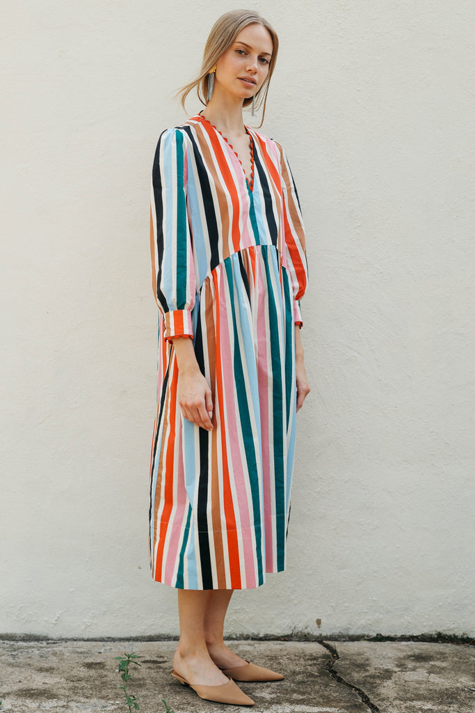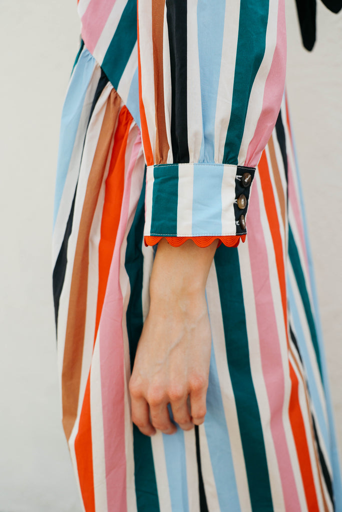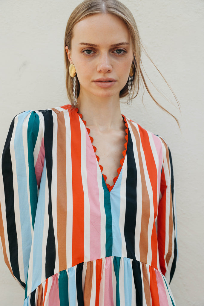 The perfect dress up or down cotton dress. Features a V-neck with scalloped trim and button closure at the wrists, this classic with a twist can be worn with sneakers, boots, sandals or heels.