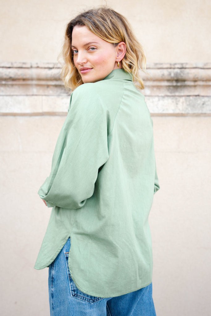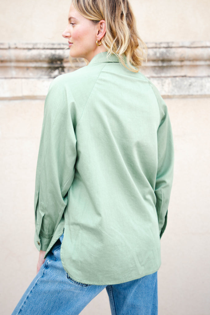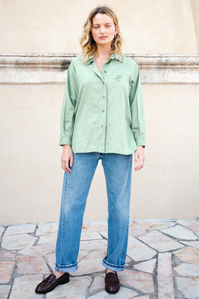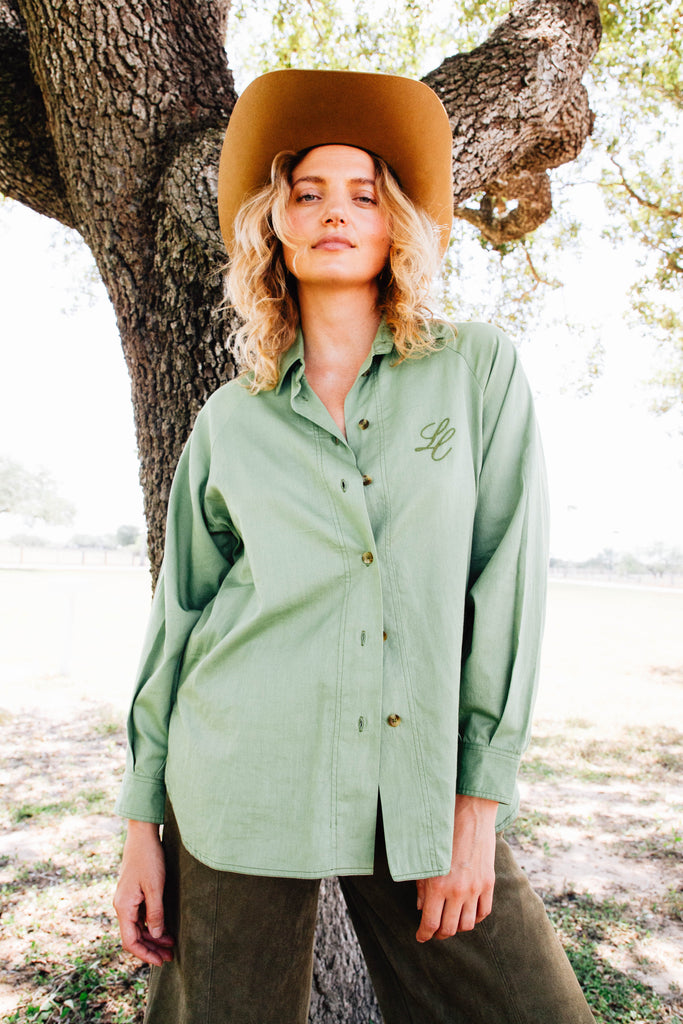 Introducing the new Lady Button Down, a reimagining of our bestselling Captain shirt. Featuring our signature raglan sleeve and button down style, this flattering shape will be your go to. Breezy cotton and an oversized fit makes for ideal ranch wear, pair with your favorite worn in denim for an effortless look. Featuring dark olive contrast stitch, oversized "LC" script embroidery, and tortoise shell buttons.