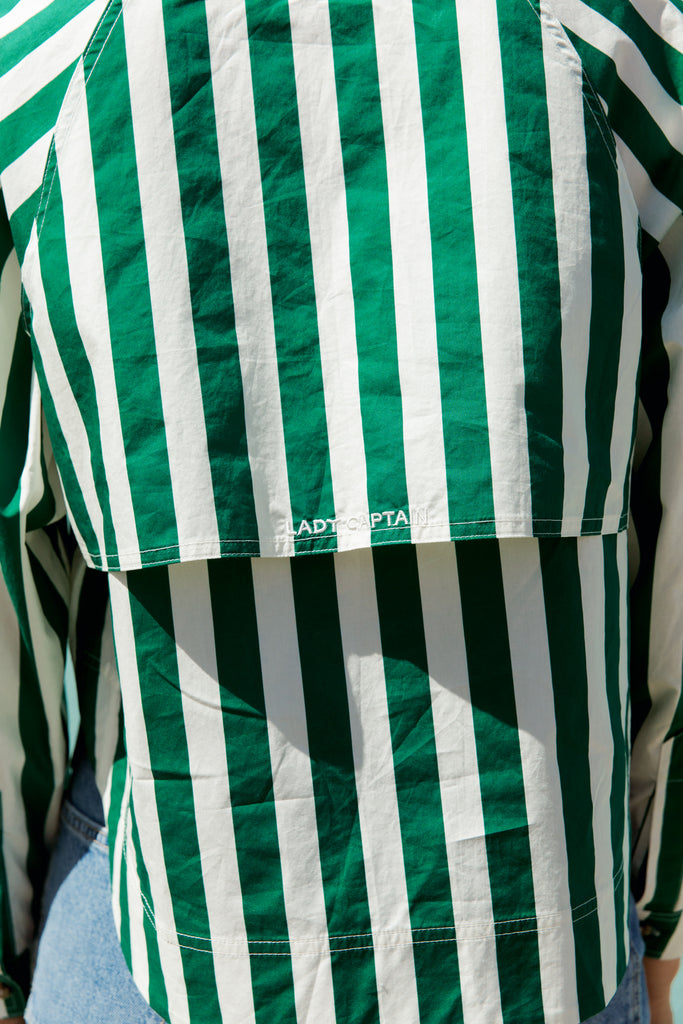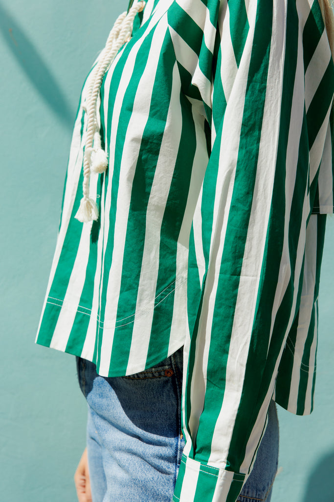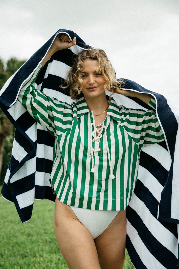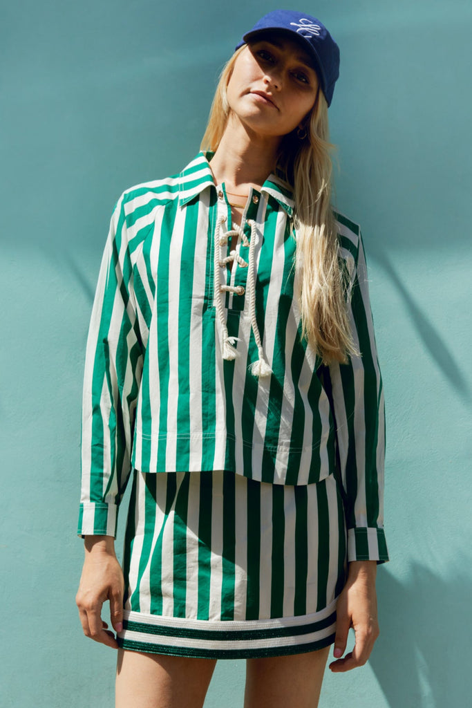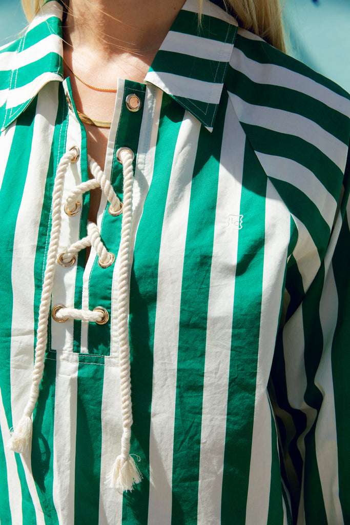 A cropped version of our favorite go-to Captain's shirt. Featuring our staple raglan sleeve for a more feminine fit, we've shortened the hem and added a lace up pop-over detail. Pair with jeans and sandals around town or wear it with our Emma Skirt in Green Cabana Stripe for the full look! Also features a vented back and water resistant fabric with Lady Captain embroidered on the back.