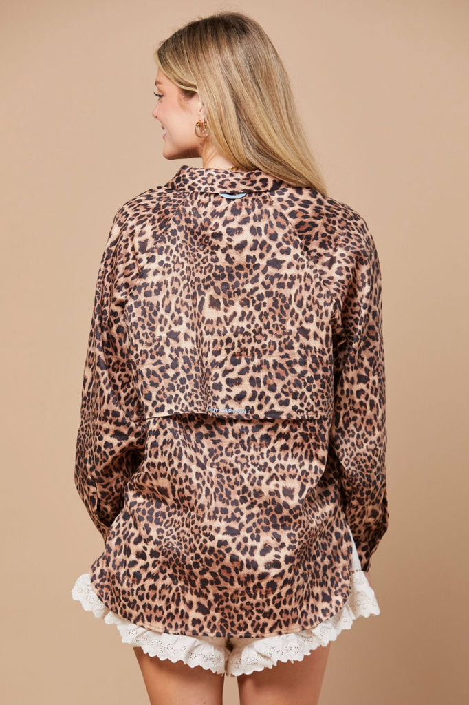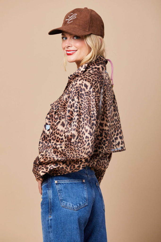 From our signature utility collection, this is not your husband's fishing shirt. Our best selling favorite, now available in a leopard print! Featuring a raglan sleeve for a more feminine fit, this shirt is great for the boat to the ranch or to dinner with friends. Pair with the matching Candace pants or with jeans and boots around town. Also features a vented back and water resistant fabric with a button front closure and velcro front pocket.