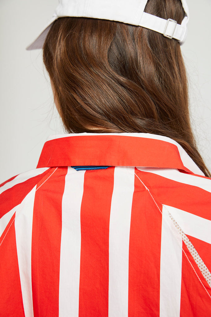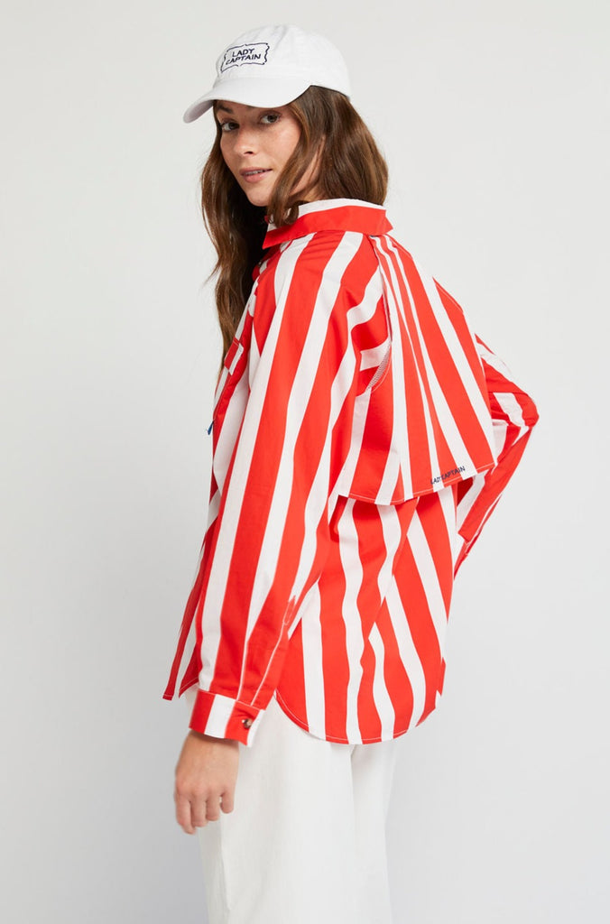 From our signature utility collection, this is not your husband's fishing shirt. Our best selling favorite, now available in a cabana stripe! Featuring a raglan sleeve for a more feminine fit, this shirt is great on or off the water. Pair with shorts and a swimsuit offshore or with jeans and sandals around town. Also features a vented back and water resistant fabric with a button front closure and velcro front pocket.