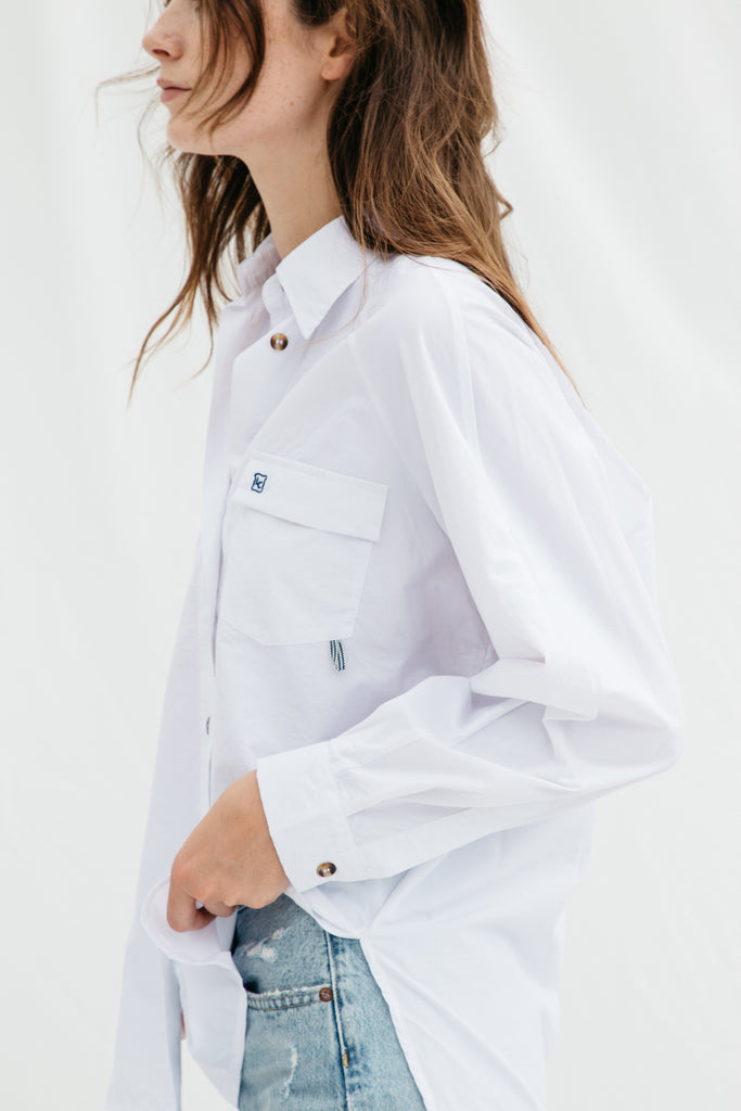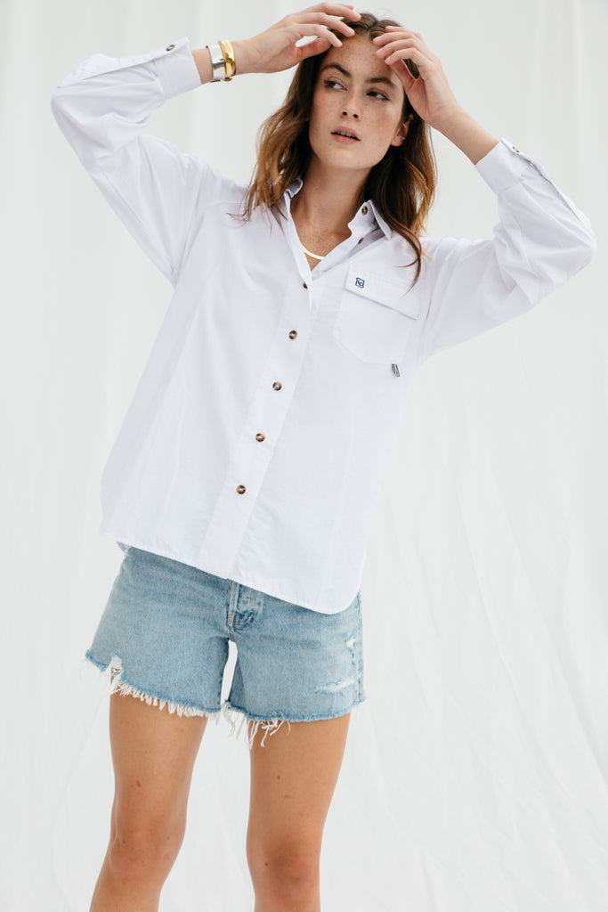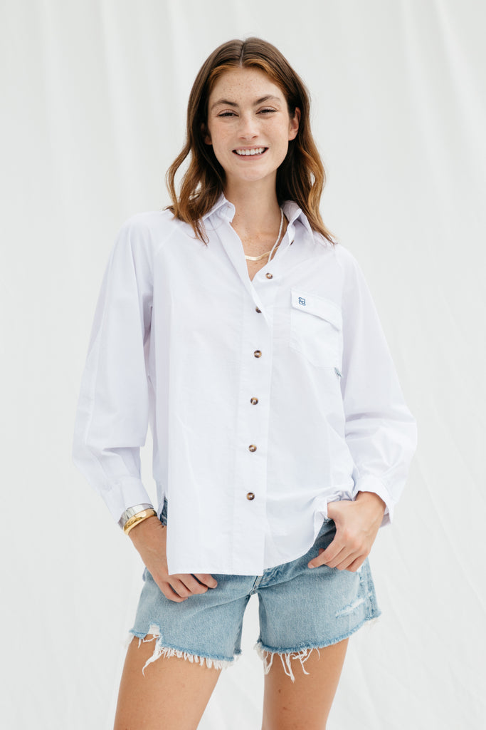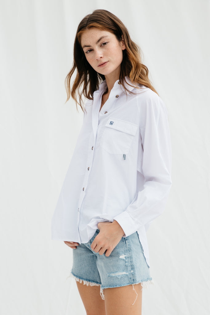 From our signature utility collection, this is not your husband's fishing shirt. Featuring a raglan sleeve for a more feminine fit, this shirt is great on or off the water. Pair with shorts and a swimsuit offshore or with jeans and sandals around town. Also features a vented back and water repellent fabric with a button front closure and velcro front pocket.