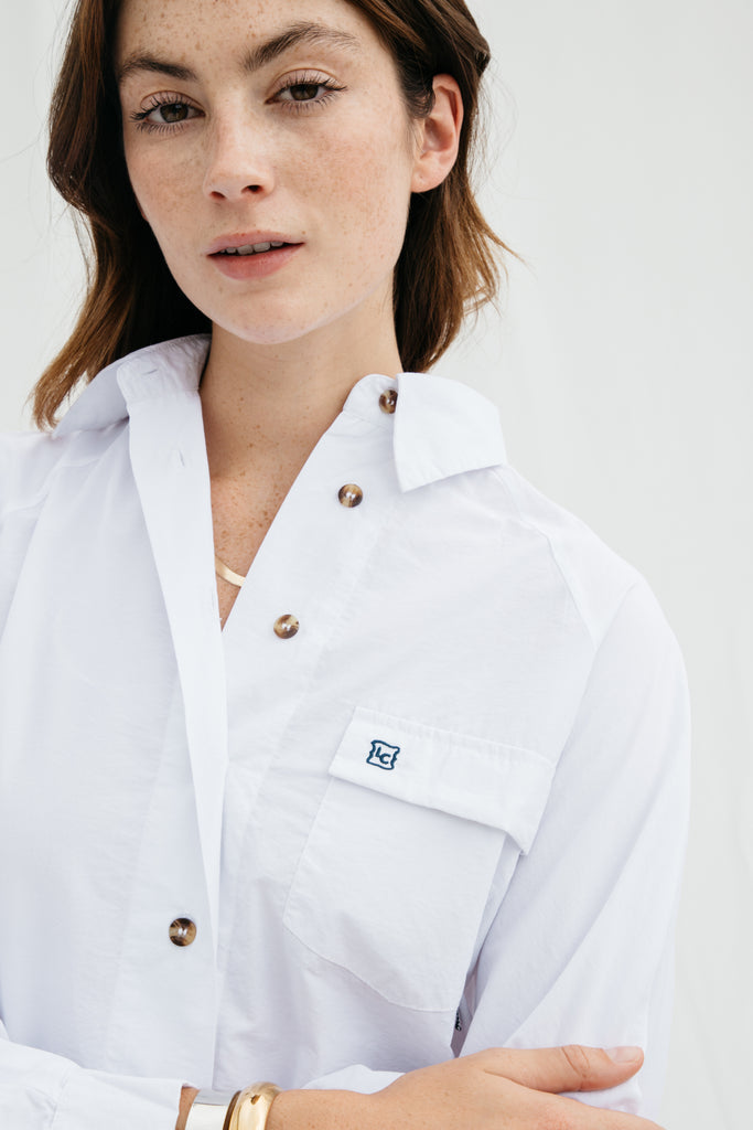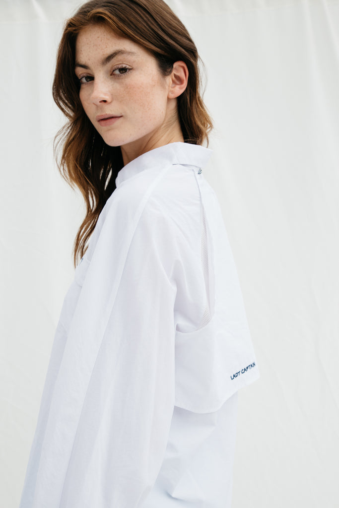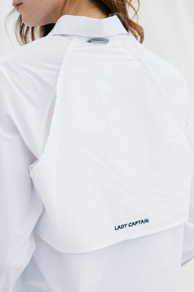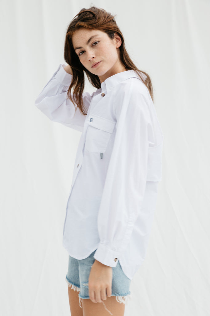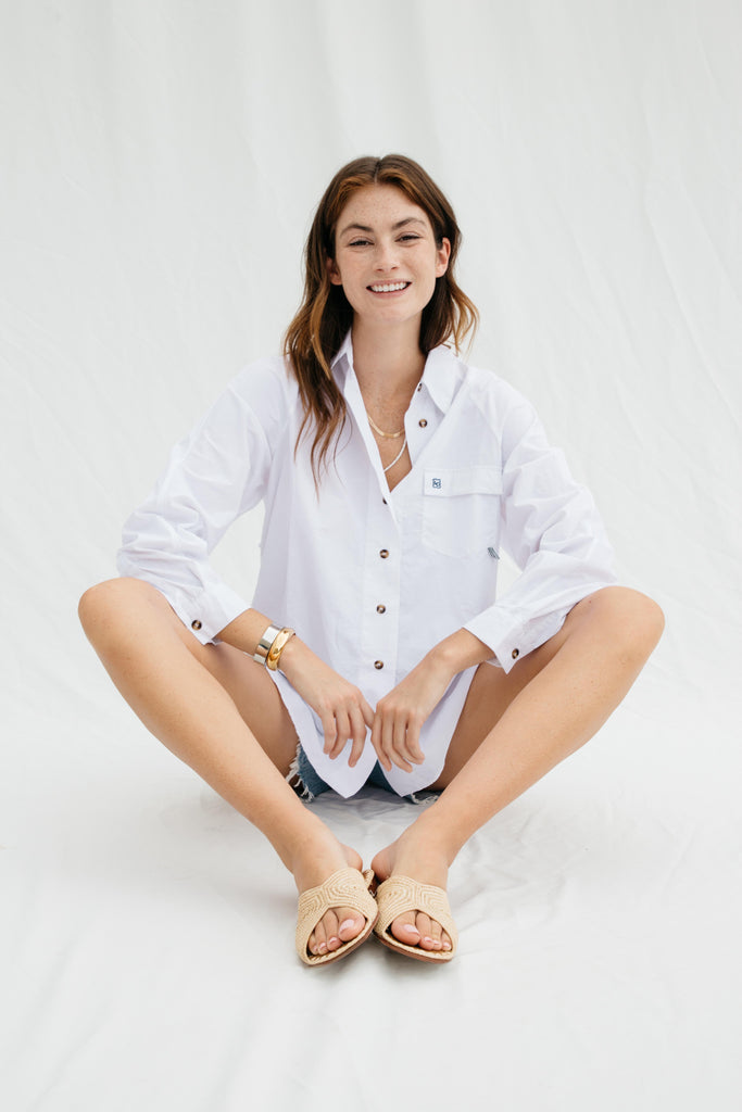 From our signature utility collection, this is not your husband's fishing shirt. Featuring a raglan sleeve for a more feminine fit, this shirt is great on or off the water. Pair with shorts and a swimsuit offshore or with jeans and sandals around town. Also features a vented back and water repellent fabric with a button front closure and velcro front pocket.